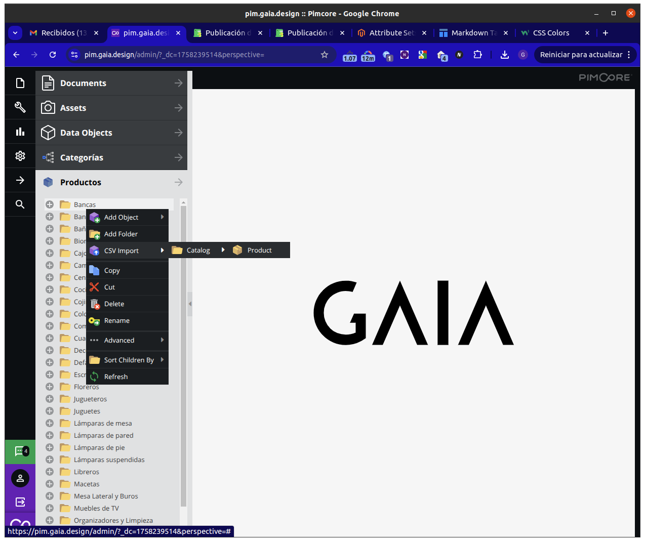 En la tab de productos hacer click en cualquier carpeta de productos e ir a CSV Import > Catalog > Product