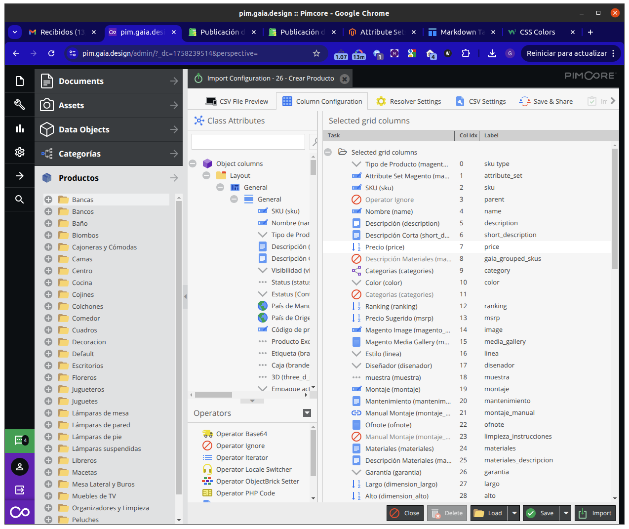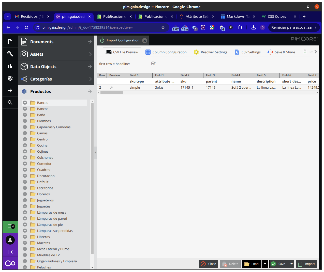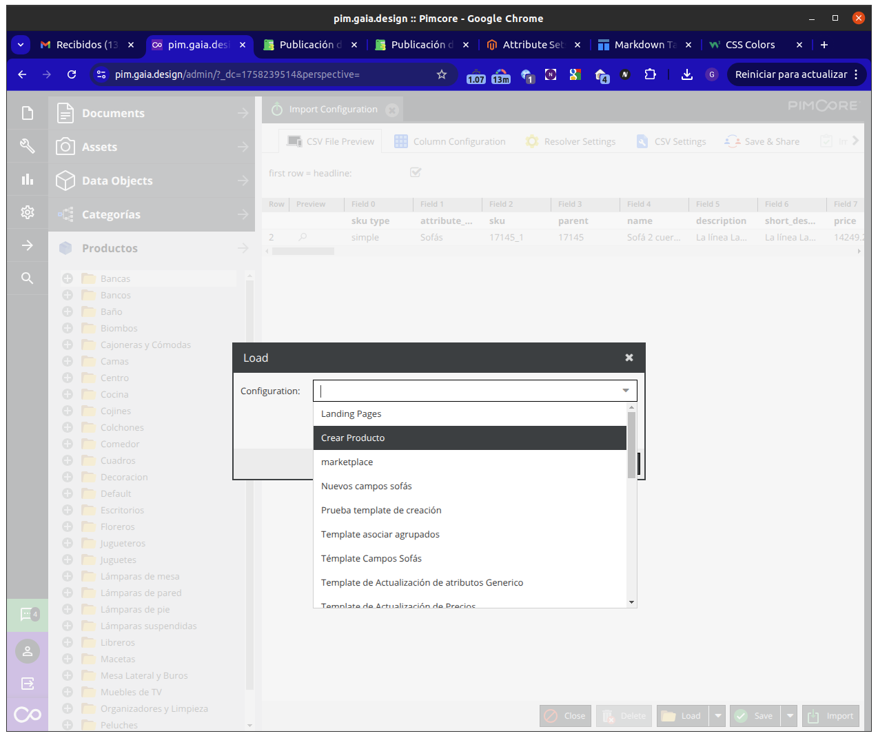 Cuando se carga la configuración hay que ir a la tab "Column Configuration" y verificar que las columnas del csv hagan match con los atributos de pim