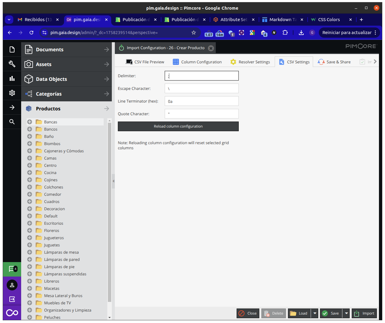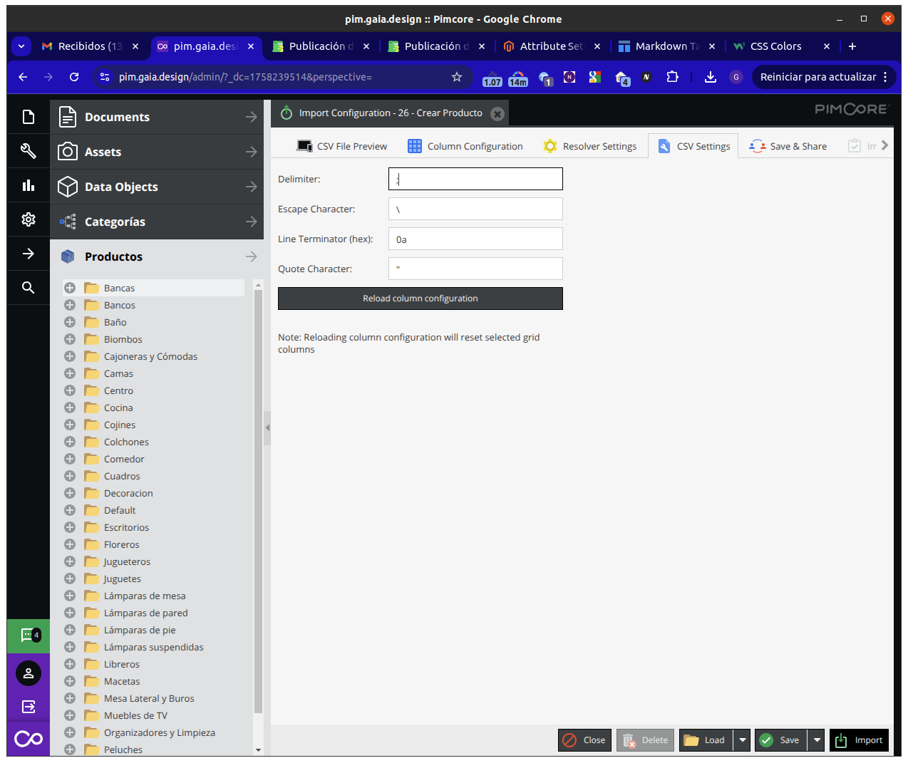 Si todo bien hay que ir a la sección CSV Settings para verificar que el delimitador sea ; o , según se necesite