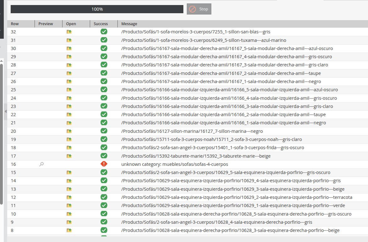 A continuación la carga iniciará y se mostrará el resultado de la importación producto por producto