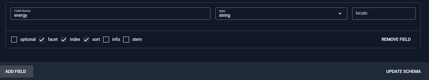 - Defines el nombre del campo 'energy' su tipo de valor 'string' y marcas las opciones que necesitas como podria ser (optional, facet, index, sort), al final guarda los cambios con el botón UPDATE SCHEMA.